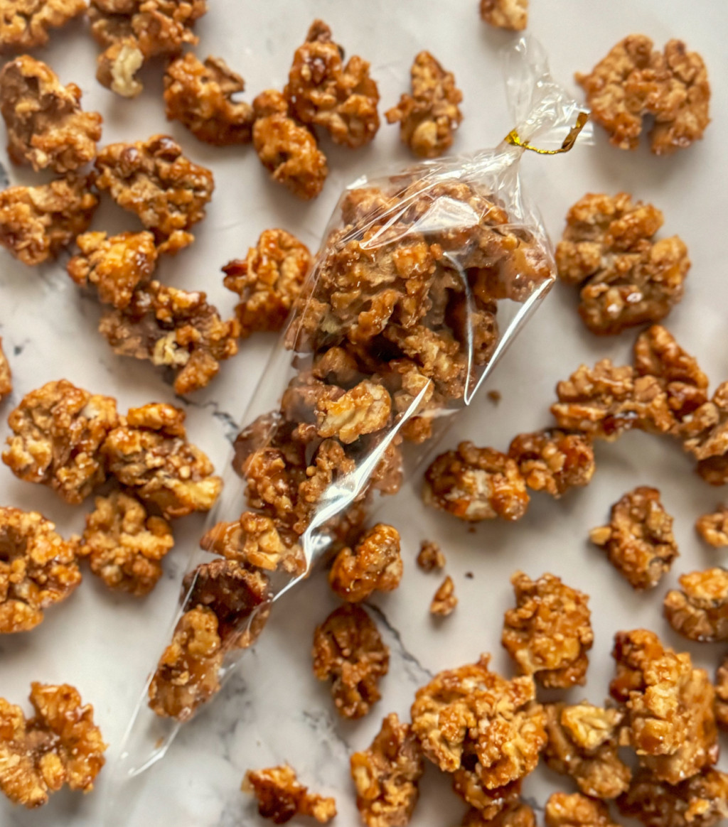 Finoman pirított dió aranyló karamellbe forgatva – kézzel készítve, szeretettel. Természetes, adalékmentes, tökéletes kis édesség. Összetevők: dió,cukor,víz.