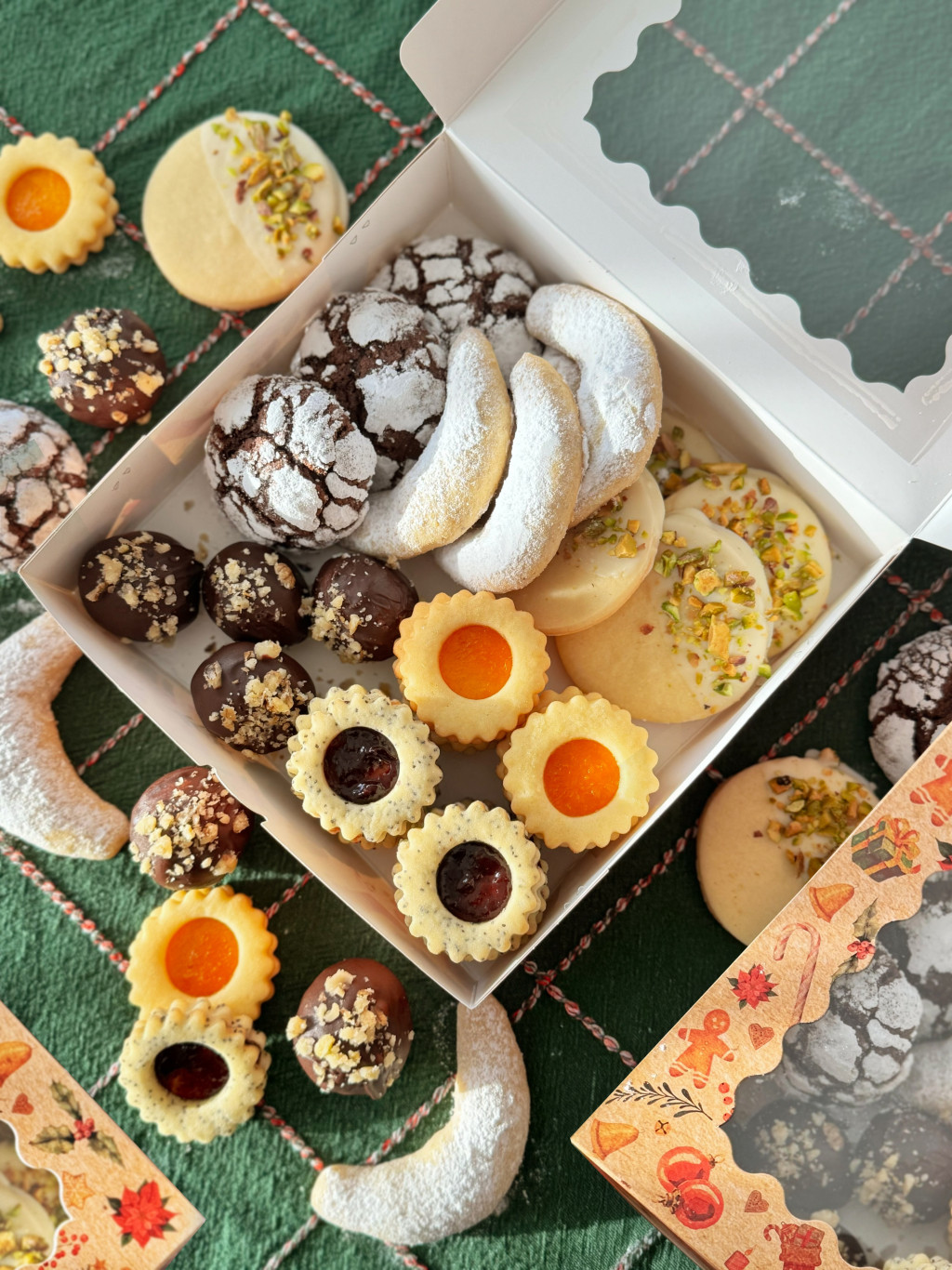 Már előrendelhető a várva várt karácsonyi sütibox! Ha a karácsony előtti forgatagban nincs kedved a sütikkel is bajlódni, de nem szeretnél lemondani a minőségi alapanyagokból, kézzel készült házi sütikről akkor ezt a dobozt kerested! Ajándékba is tökéletes választás! A doboz tartalmaz: 8 linzert 8 mákos-szilvás linzert 4 zserbógolyót 4 diós-vaníliás hókiflit 4 fehércsokis-pisztáciás kekszet 3 db csokis pöfeteg kekszet