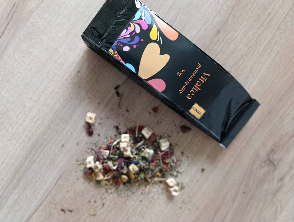 Összetétel: csipkehús, alma, hibiszkuszvirág, fekete bodza, borsmenta, málnalevél, ánizsmag, köménymag, szederlevél, eperlevél, mogyorólevél, narancshéj, körömvirág szirom, napraforgóvirág szirom, rózsaszirom, citromfű, lándzsás útifű, természetes aroma 50g/csomag Vitaltea Immunerősítő - relaxáló teakeverék. Töltsd fel magad természetesen! Időnként mindannyiunknak szükségünk van egy kis energiára – testnek és léleknek egyaránt. A Vitaltea vitalizáló teakeverék a természet erejével támogatja a szervezet egyensúlyát és energiaszintjét. Különleges, gondosan válogatott összetevői – csipkehús, alma, hibiszkuszvirág, bodza, borsmenta, málnalevél, ánizsmag, köménymag, szeder-, eper- és mogyorólevél, narancshéj, körömvirág, napraforgó-, rózsa- és citromfű – valódi ízbombát alkotnak. Ez a tea nemcsak élettel tölti fel a szervezetet, de illatával és színeivel is igazi élmény minden csésze. A Vitaltea mesterséges színezéket és aromát nem tartalmaz! A természetes aroma a szárított virágok alkoholos kivonatából származik. Eredmény: frissítő, harmonizáló, természetes energia minden kortyban. Elkészítése és fogyasztása: 100 C tisztított víz Adagolása: 1 tk tea /2dl víz, Áztatási idő: 5-10 perc