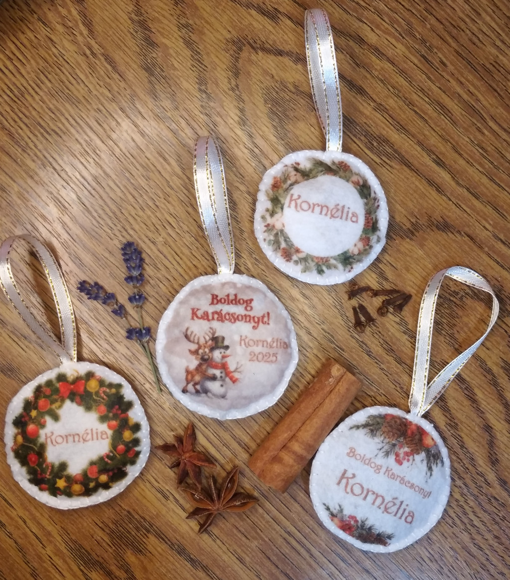 6,5 - 7 cm kör átmérőjű fűszeres illatokkal kérhető filc alapú névre szóló karácsonyfa dísz.