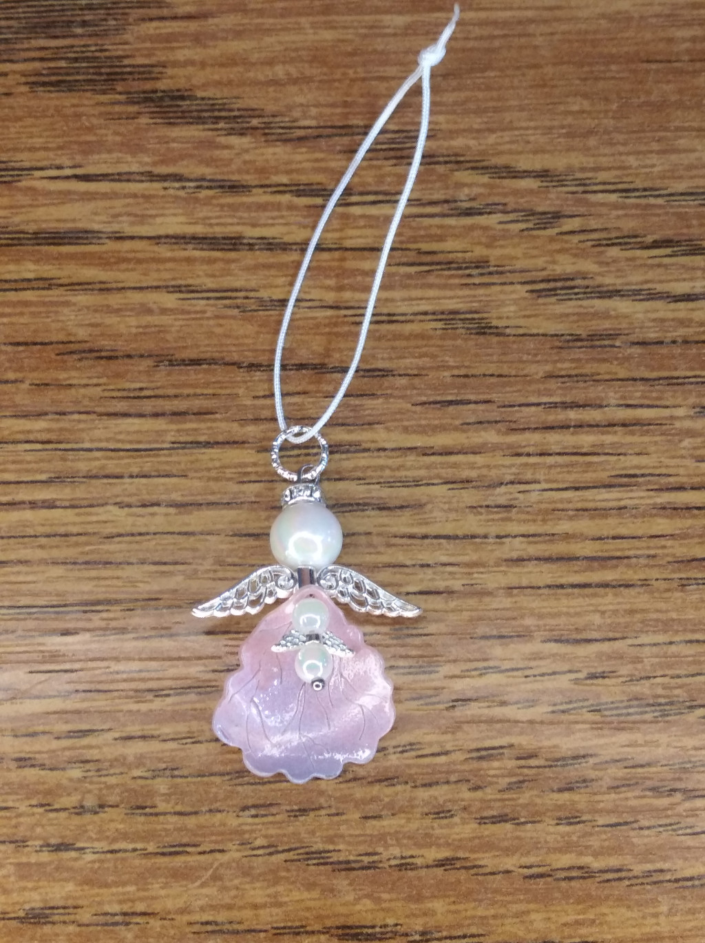 Angyalka babával akasztó nélkül kb 5 cm. Tekla gyöngy, formagyöngy, ezüst színű köztesből és szárnyból készült függő dísz.